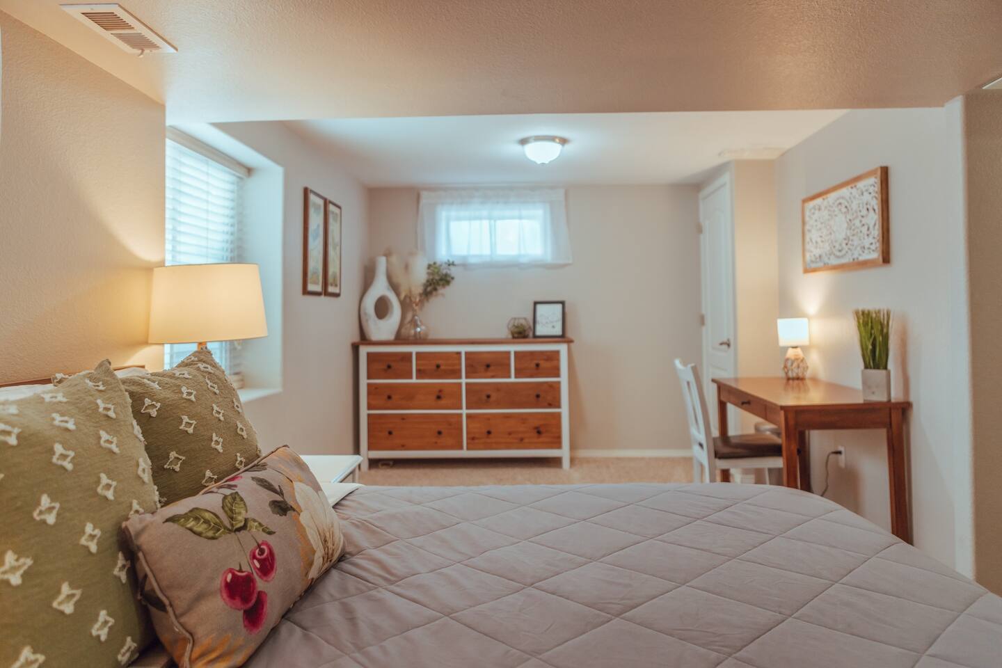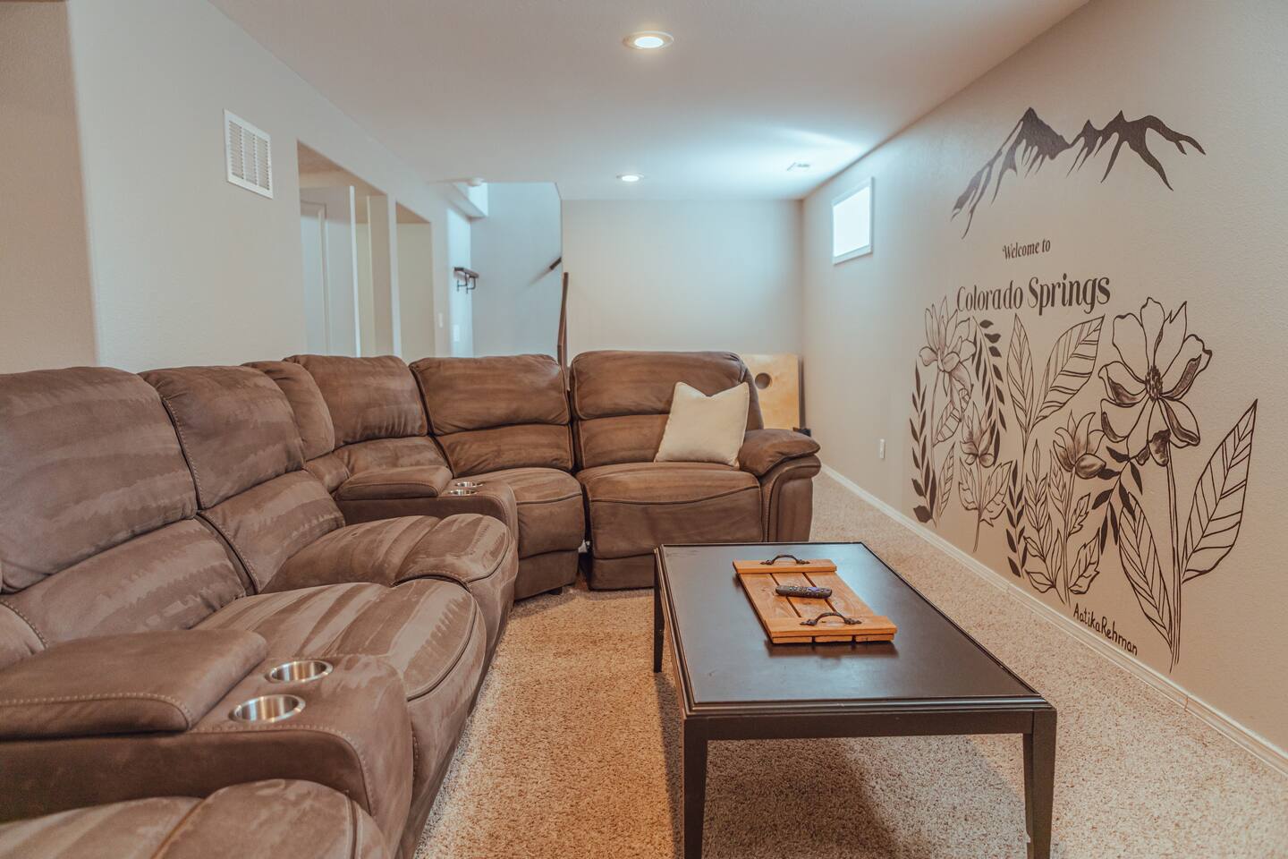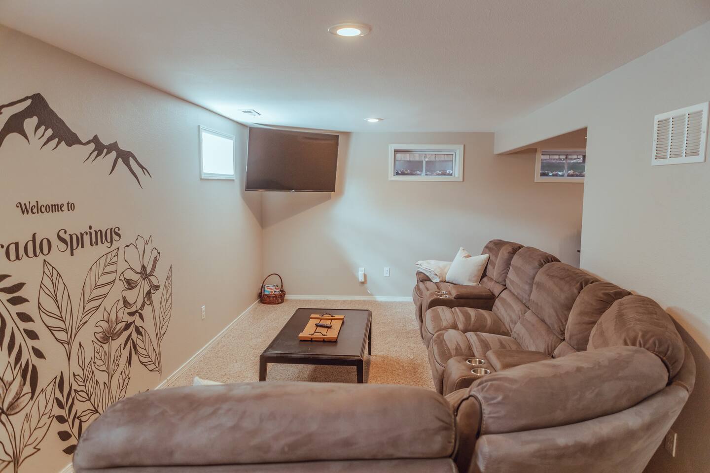 Located in a quiet, family-friendly neighborhood just 5 minutes from downtown, this home is perfect for groups looking to stay central while having space to relax. With two separate living areas, everyone has room to spread out. The main level is ideal for gathering, with an open kitchen, dining space, and living area. The lower level features a private primary suite with a full bathroom, dedicated workspace, and a cozy movie lounge with a reclining couch and 55” TV. You’re also just minutes from Patty Jewett Golf Course and close to many of Colorado Springs’ top attractions. Outdoor Living The fully fenced backyard is designed for relaxing after a day of exploring and spending time together. Enjoy the private hot tub, built-in gas fire pit, and BBQ grill. Family-Friendly Amenities Traveling with little ones? We’ve got you covered with a pack ’n play, highchair, kids’ dishes, toys, and books. Parking Private driveway for 2 vehicles, plus additional free street parking directly in front of the home.